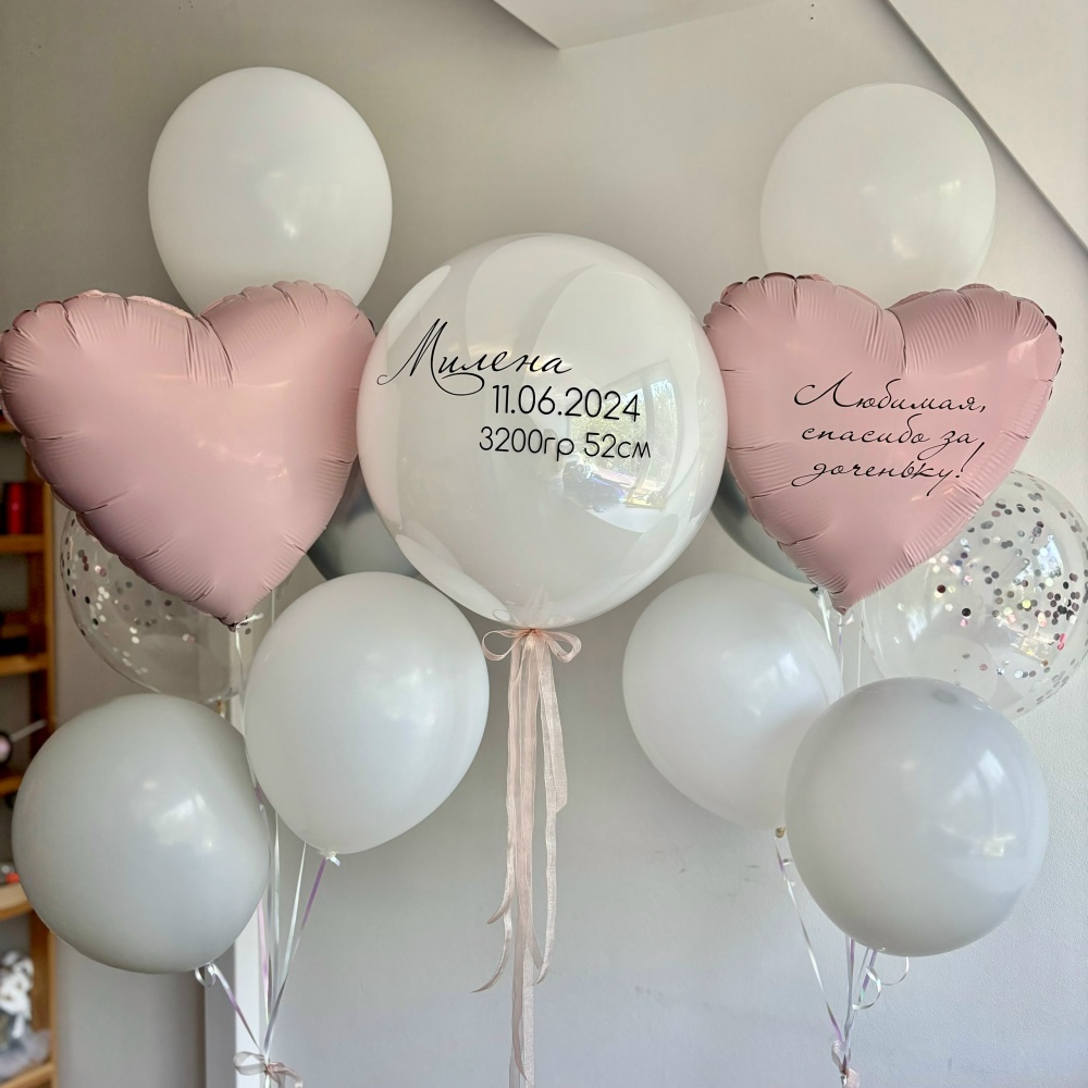 2 связки из 2 белых шаров, 1 серого шара, 1 серебряного шара, 1 шара с конфетти, 1 сердца)