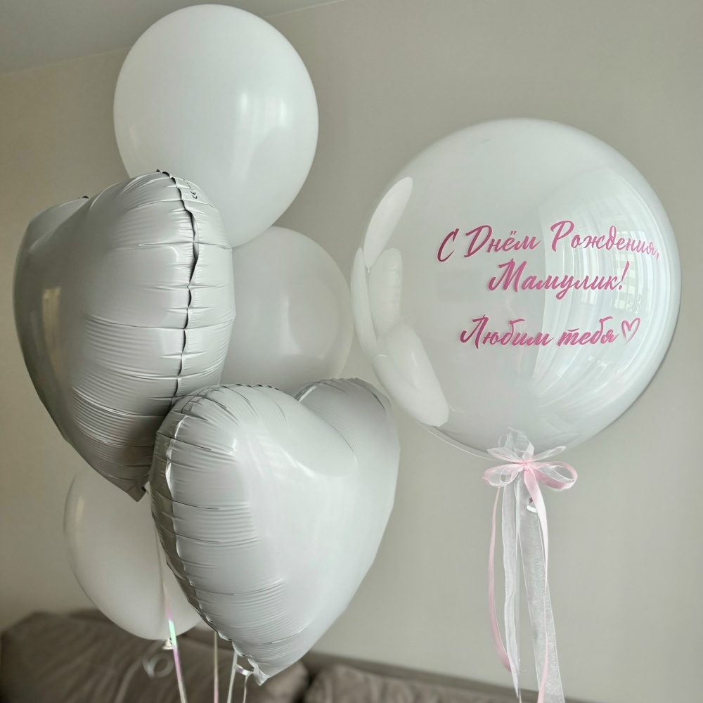 В набор входит: Связка из 3х шаров белых, 2х сердец Шар двойной с надписью (45см)