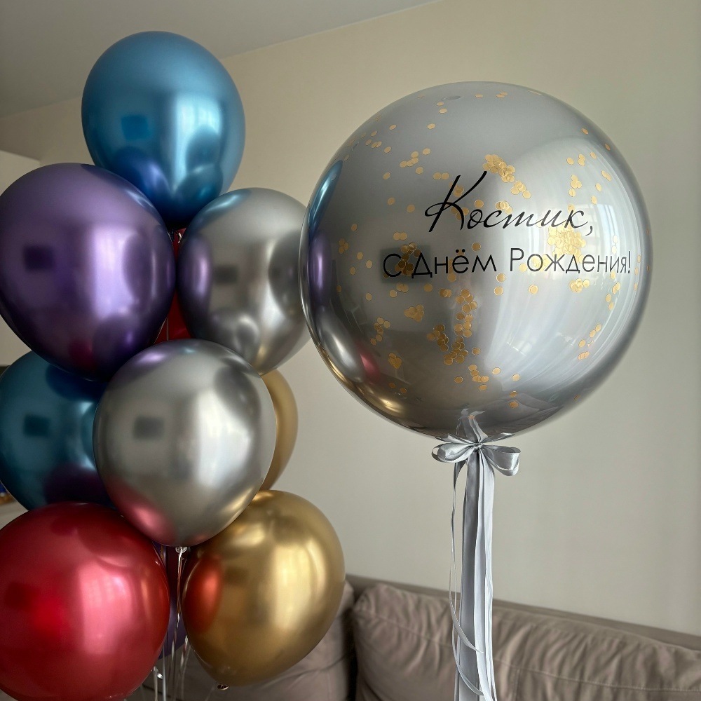 В набор входит: Шар гигант хром двойной с надписью Связка 10 шаров хром