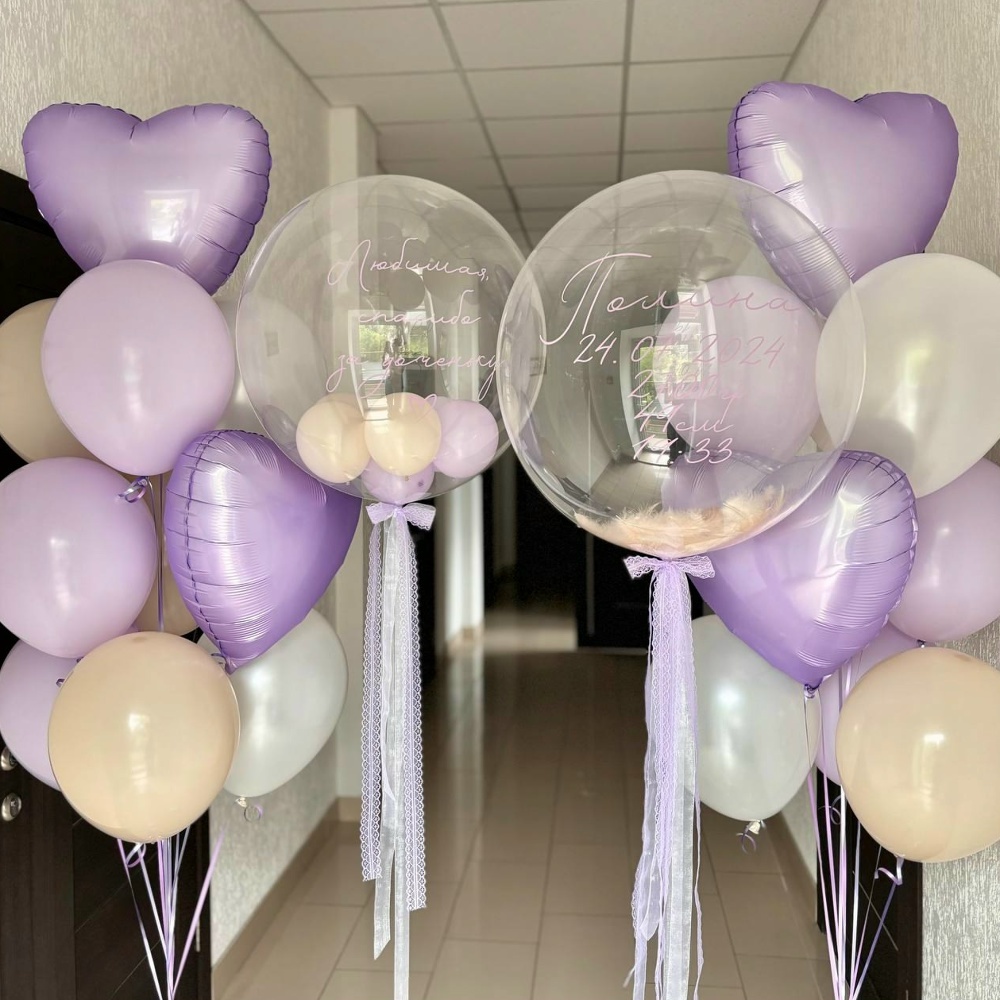 В набор входит: 2 связки по 10 шаров Баблс шар с перышками внутри и надписью Баблс шар с маленькими шарами внутри и надписью