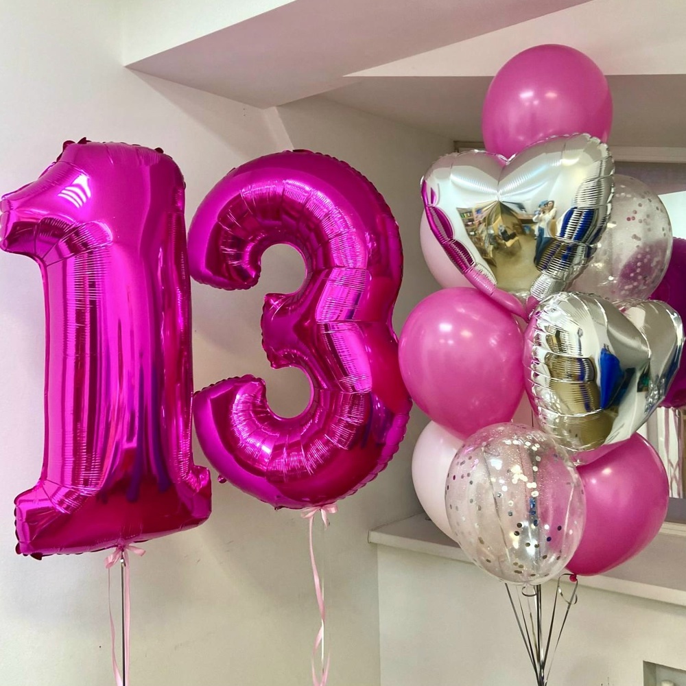 связка: 3 шара фуксия, 3 нежно розовых шара, 2 шара с конфетти, 2 сердца 2 цифры ( на выбор)