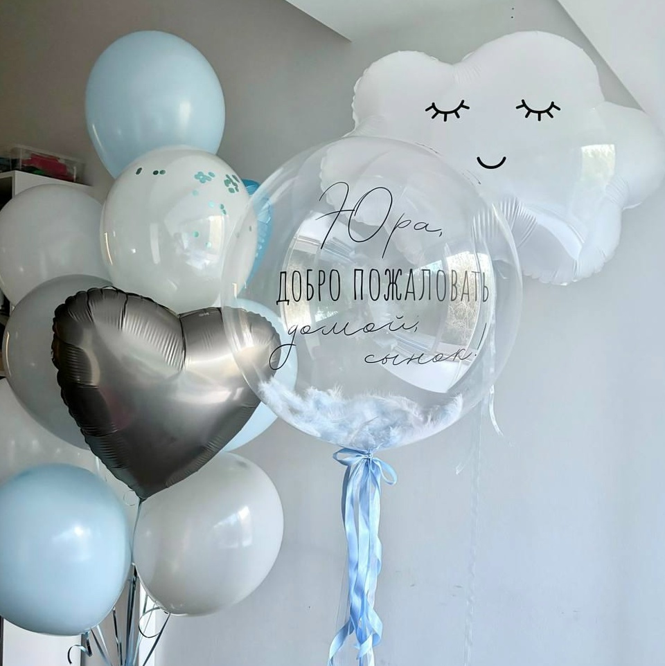 В набор входит: связка из 11 шаров баблс с перышками и надписью фигура облако