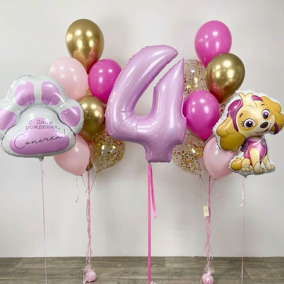 в набор входит: 2 связки по 10 шаров цифра ( на выбор) фигура щенячий патруль фигура лапка с надписью
