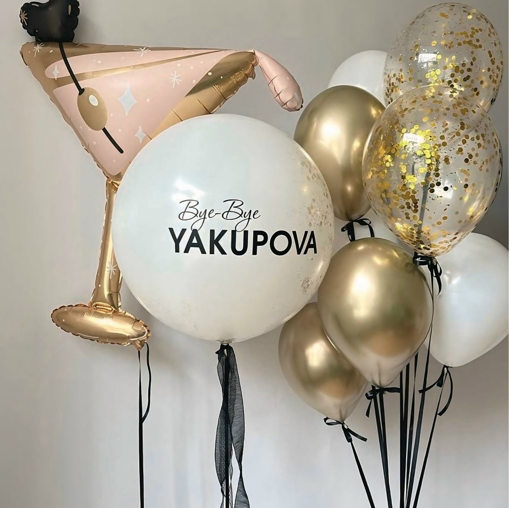 В набор входит: Связка из 9 Шаров на атласных лентах Шар гигант с новой фамилией внутри Фигура мартини