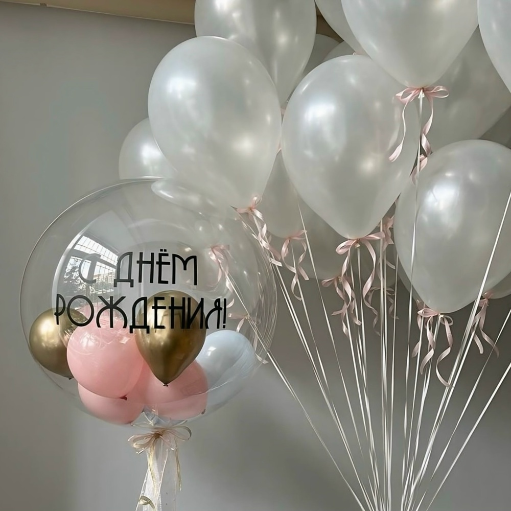 В набор входит: 20 перламутровых Шаров с бантиками в потолок Баблс с маленькими шариками внутри и надписью