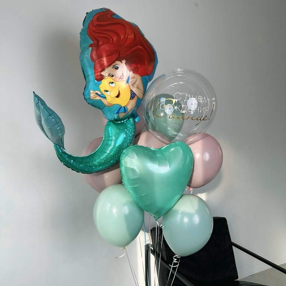 В набор входит: Связка из 9 Шаров, 1 сердца, шара баблс с надписью и фигуры Русалки