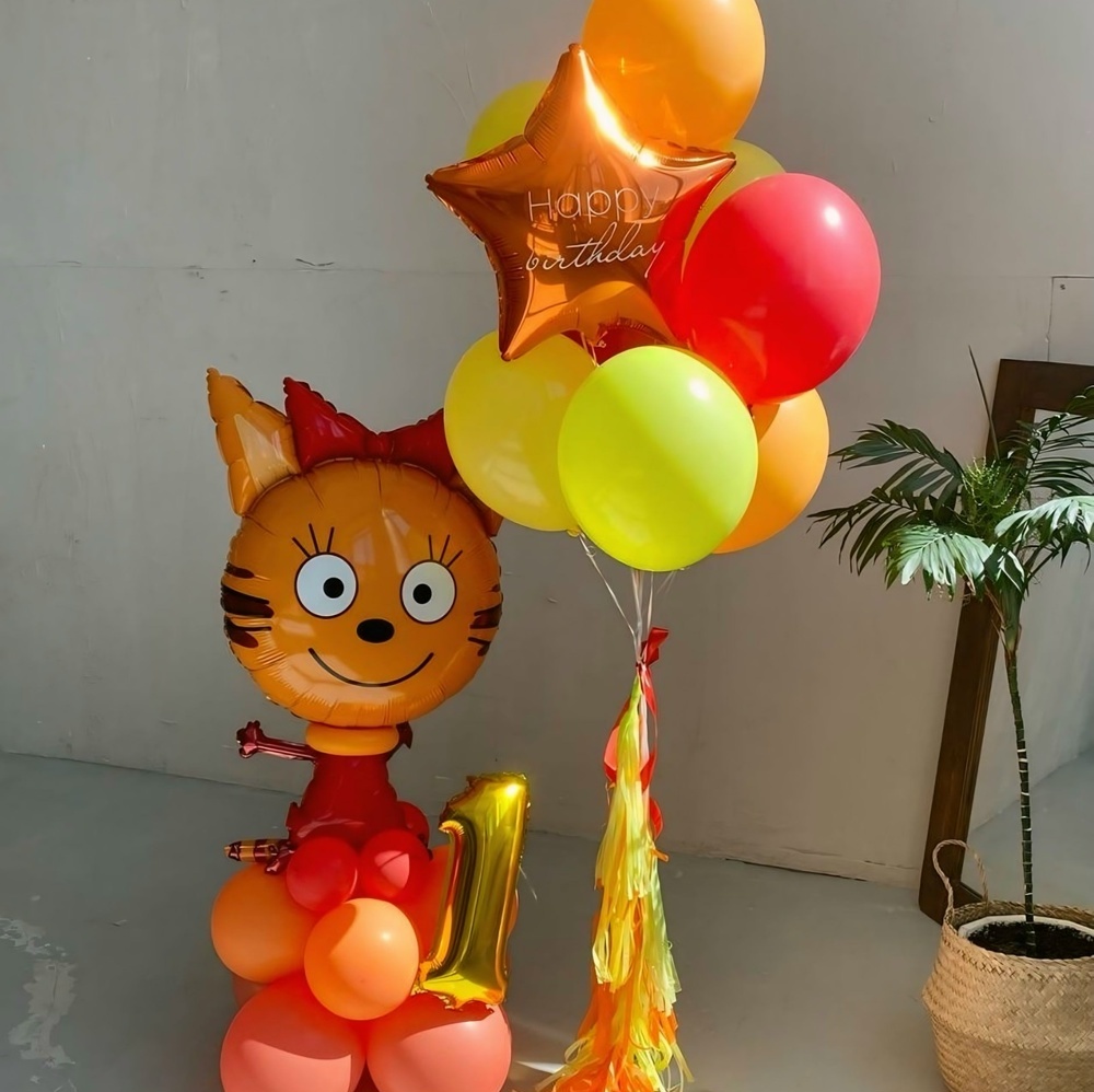 В набор входит: Связка из 8 Шаров и 1 звезды с надписью Фигура «три кота» на стойке из Шаров с цифрой
