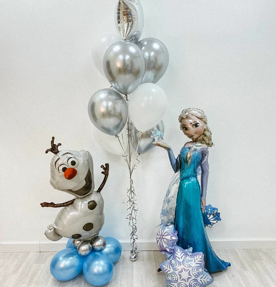 В набор входит: Связка из 9 Шаров Фигура снеговика на подставке Ходячая фигура Эльза