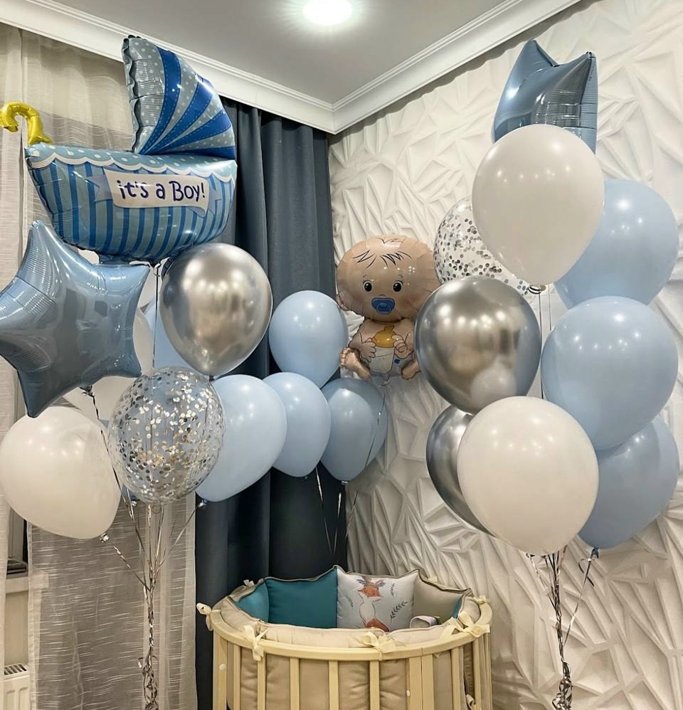 В набор входит: Связка из 9 Шаров и 1 звезды Связка из 8 Шаров, 1 звезды и фигуры коляски Фигура малыша и 3 шара