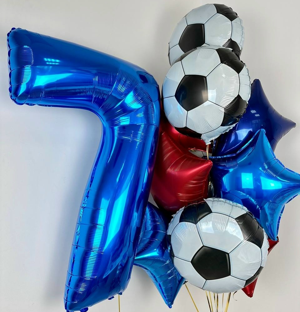В набор входит: Связка из 6 звёзд и 3 футбольных мячей Цифра (на выбор)
