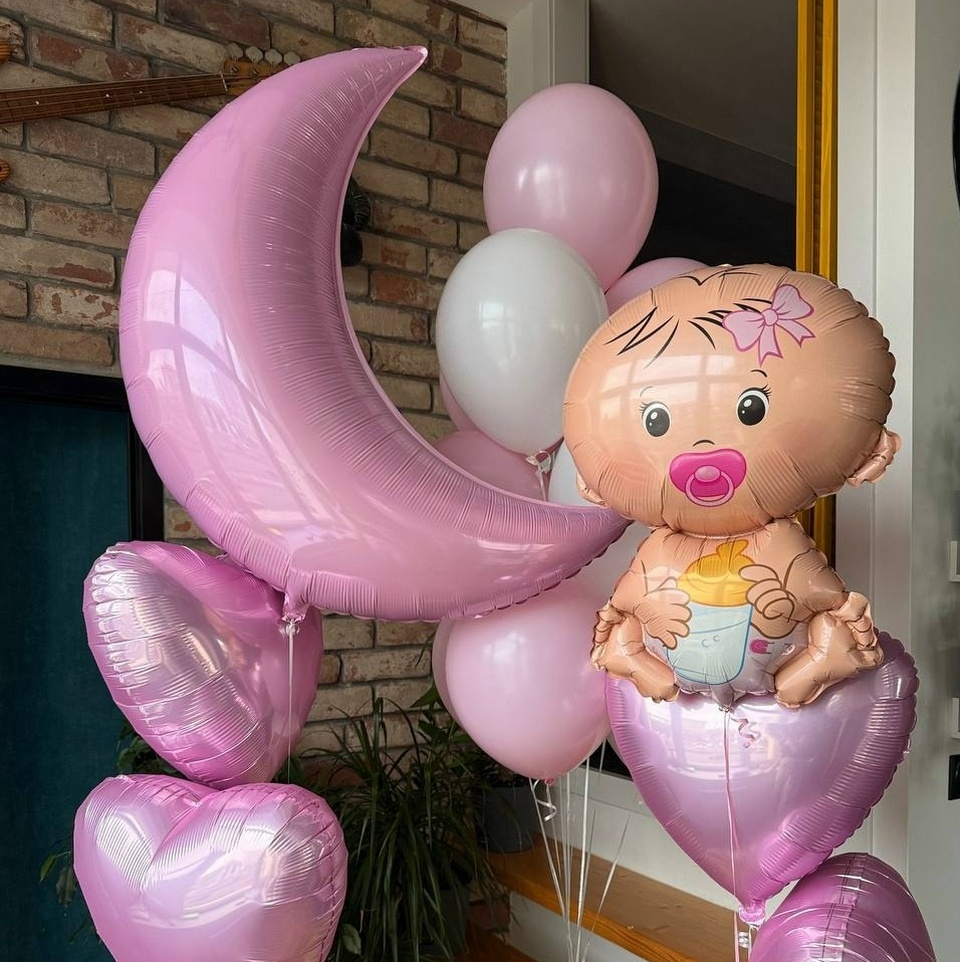 В набор входит: Связка(5 розовых шаров, 5 белых шаров), связка (месяц, 2 сердца), связка (малыш, 2 сердца)