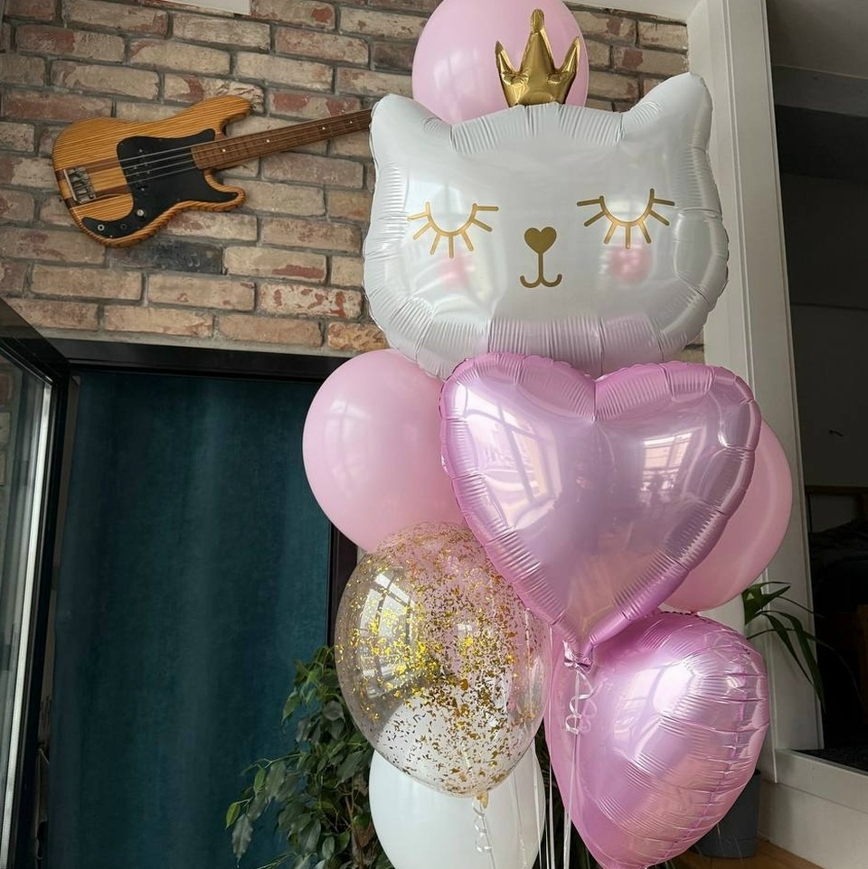 В набор входит: связка ( 4 розовых шара, 3 белых шара, 2 шара с конфетти, 2 сердца. кошечка с короной)