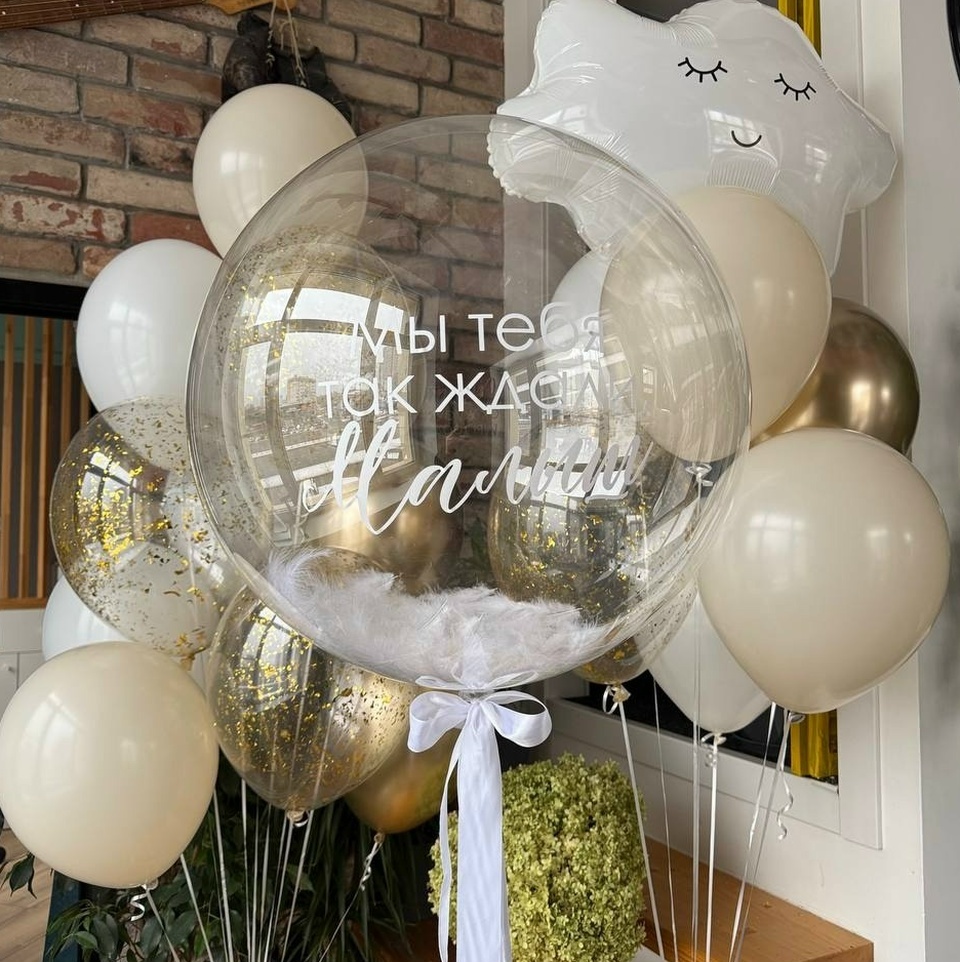 связка ( 3 белых шара, 3 бежевых шара, 3 золотых шара, 3 шара с конфетти), связка ( 2 белых шара, 2 бежевых шара, 1 шар с конфетти, 1 шар золотой, облако), баблс с перьями и надписью