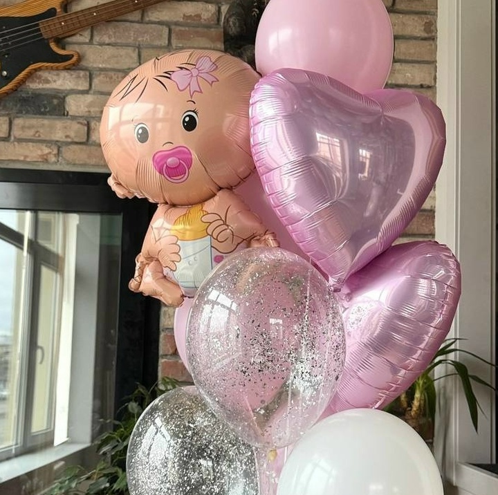 В набор входит: связка (2 белых шара, 3 розовых шара, 2 шара с конфетти, 2 сердца, малыш)