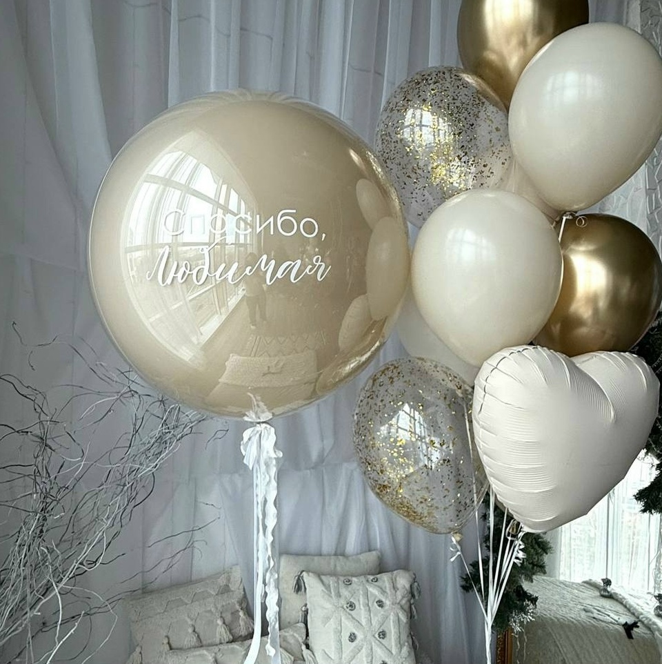 В набор входит: связка ( 5 бежевых шаров, 2 золотых шара, 2 шара с конфетти,1 сердце), зеркальный шар с надписью