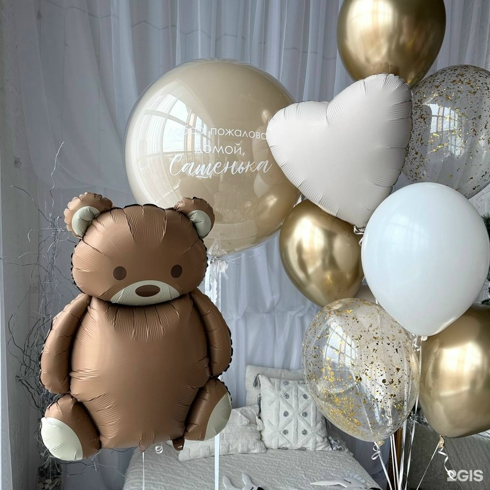В набор входит: связка( 1 белый шар, 2 бежевых шара, 3 золотых шара, 2 шара с конфетти 2 сердца),зеркальный шар с надписью, мишка