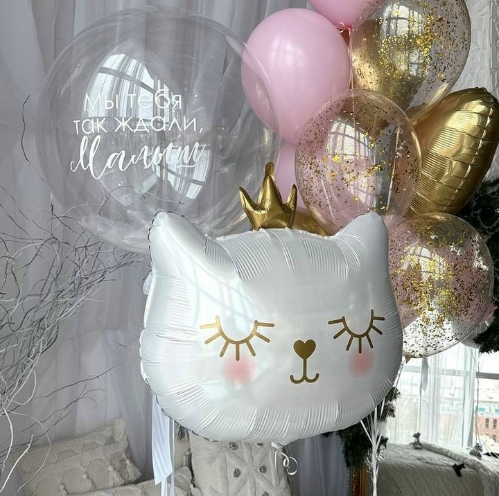 В набор входит: связка( 4 розовых шара, 3 шара с конфетти, 1 золотой шар, 2 сердца), баблс с перьями и надписью, кошечка с короной
