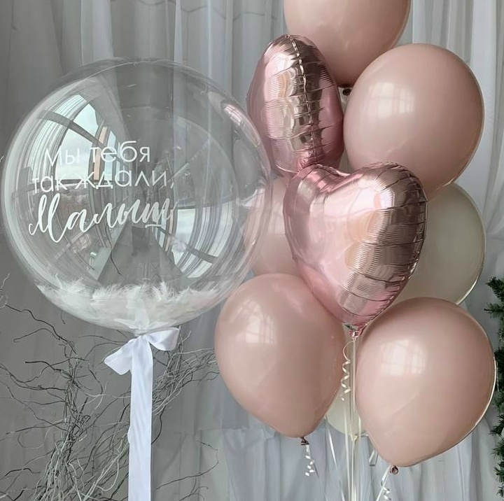 В набор входит: связка( 5 шаров пыльная роза, 3 кремовых шара, 2 сердца), баблс с перьями и надписью