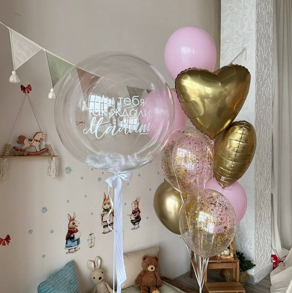 В набор входит: Связка (4 розовых шара, 3 шара с конфетти, 1 золотой шар, 2 сердца), баблс с перьями и надписью