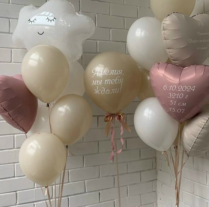 Связка ( 3 бежевых шара, 2 белых шара, 1 сердце, облако), связка ( 3 белых шара, 4 бежевых шара, 2 сердца с надписью, 1 сердце), Шар 45 см с надписью