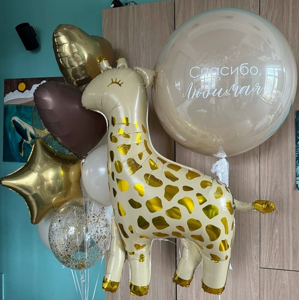 В набор входит: связка (2 бежевых шара, 2 белых шара, 2 сердца, 1 звезда, 2 шара с конфетти), жираф, зеркальный шар с надписью