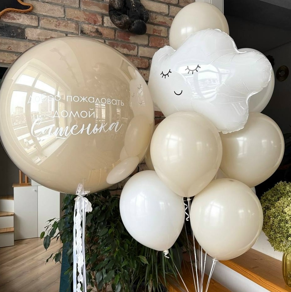 В набор входит: Связка ( 5 бежевых шаров, 4 белых шара, облако), зеркальный шар с надписью