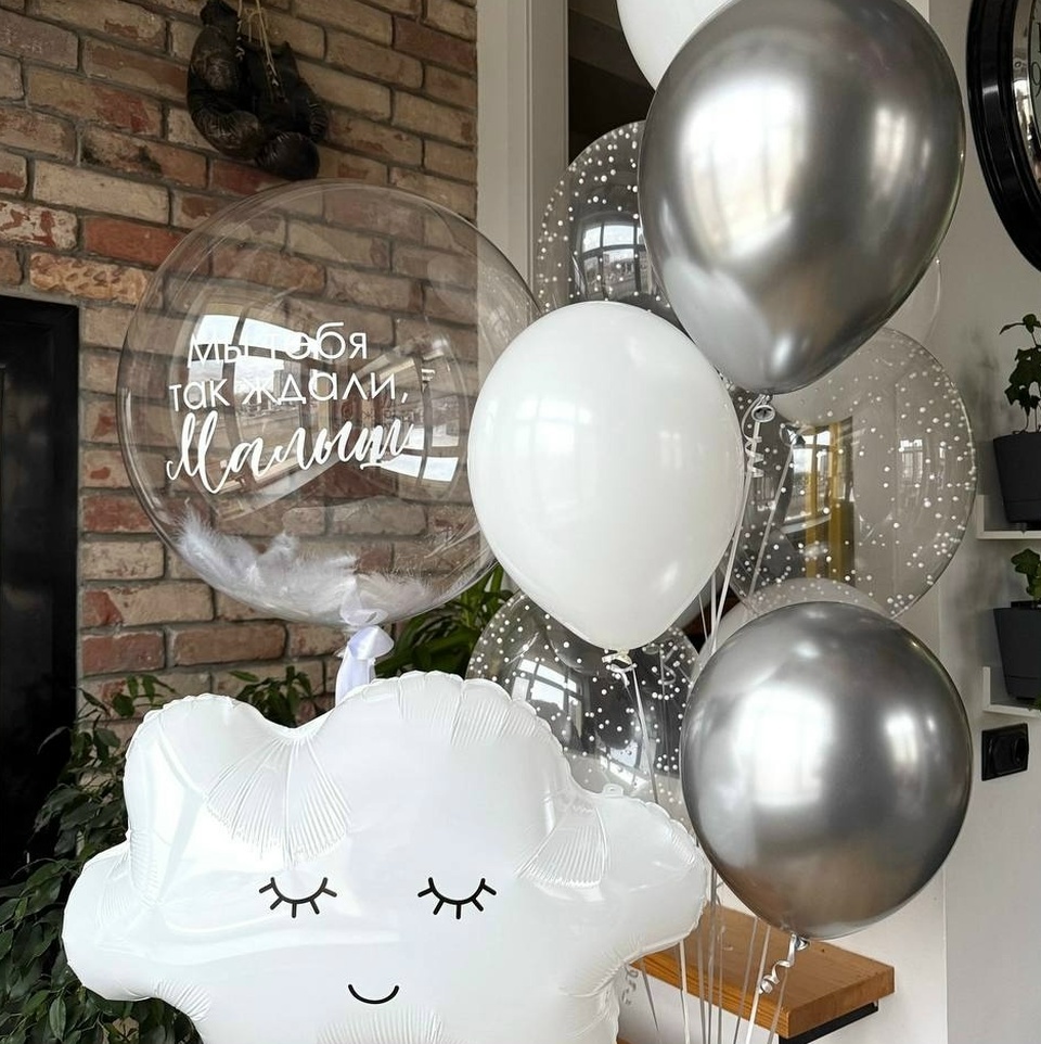 В набор входит: связка (3 серебряных шара, 4 белых шара, 3 шара с конфетти), облако, баблс с перьями и надписью