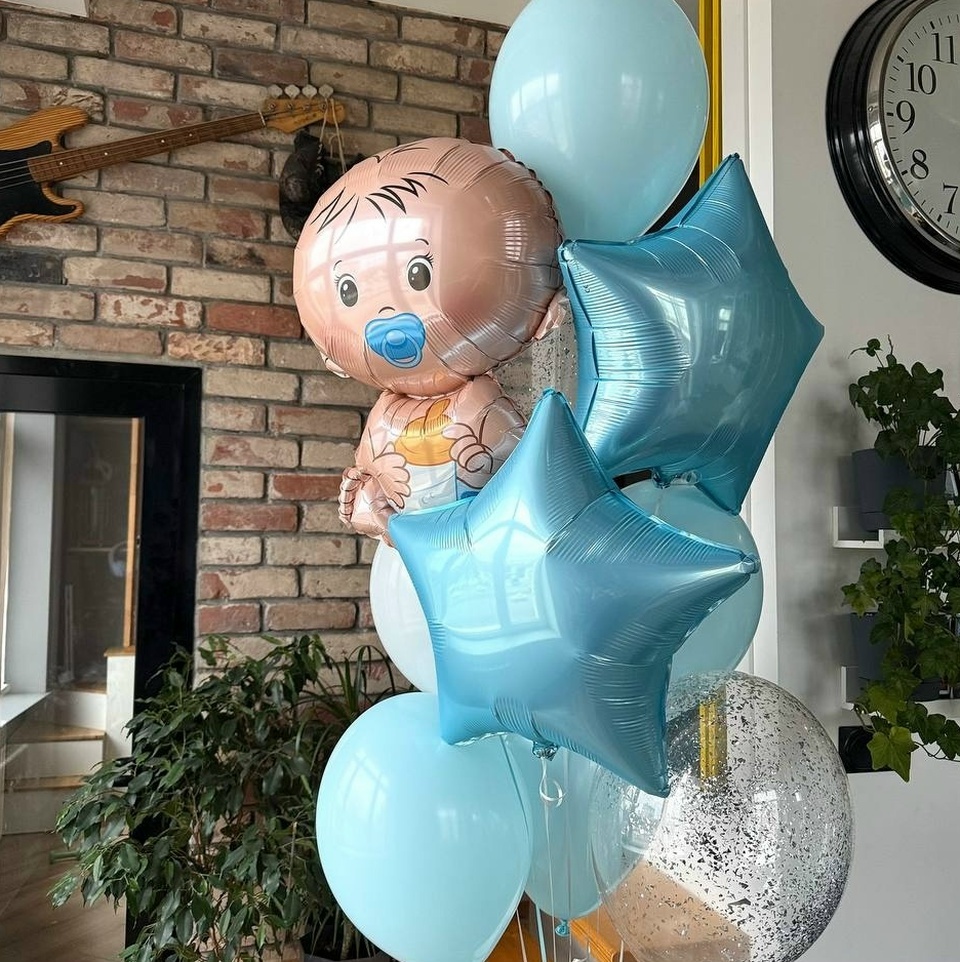 В набор входит: связка(3 голубых шара, 1 белый шар, 2 шара с конфетти,2 звезды, малыш)