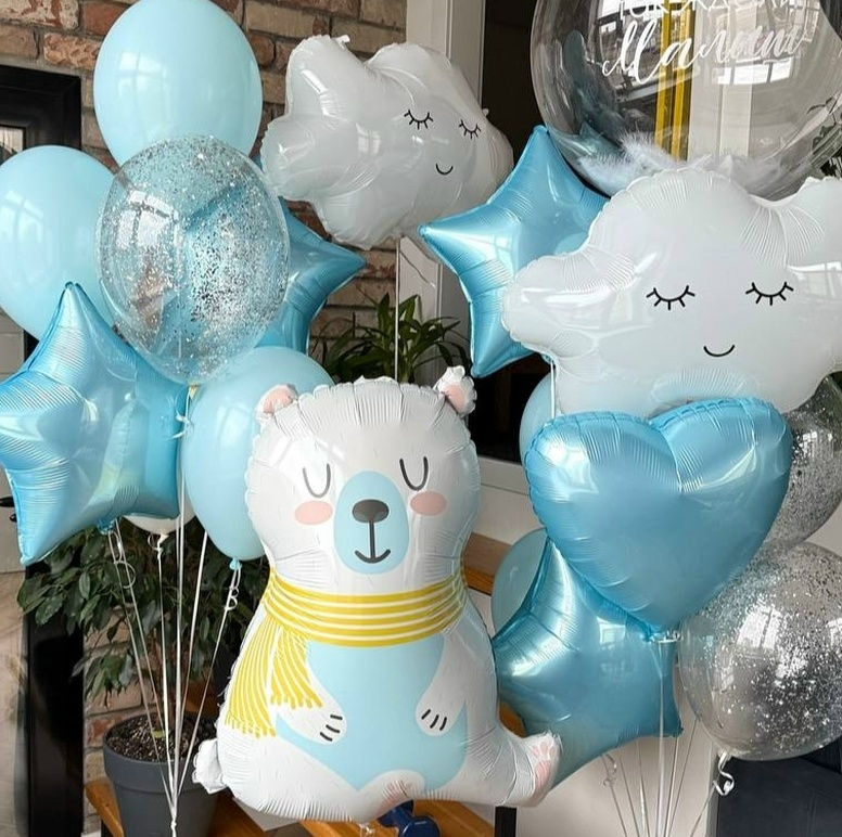 связка( 3 голубых шара, 1 белый шар, 1 шар с конфетти, 2 звезды), связка( баблс шар с перьями и надписью, облако, 2 звезды, 1 сердце, 3 голубых шара, 2 шара с конфетти), мишка, облако
