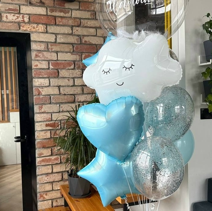 В набор входит: Связка( 4 голубых шара, 3 шара с конфетти, 2 звезды, 1 сердце, облако, баблс с перьями и надписью)