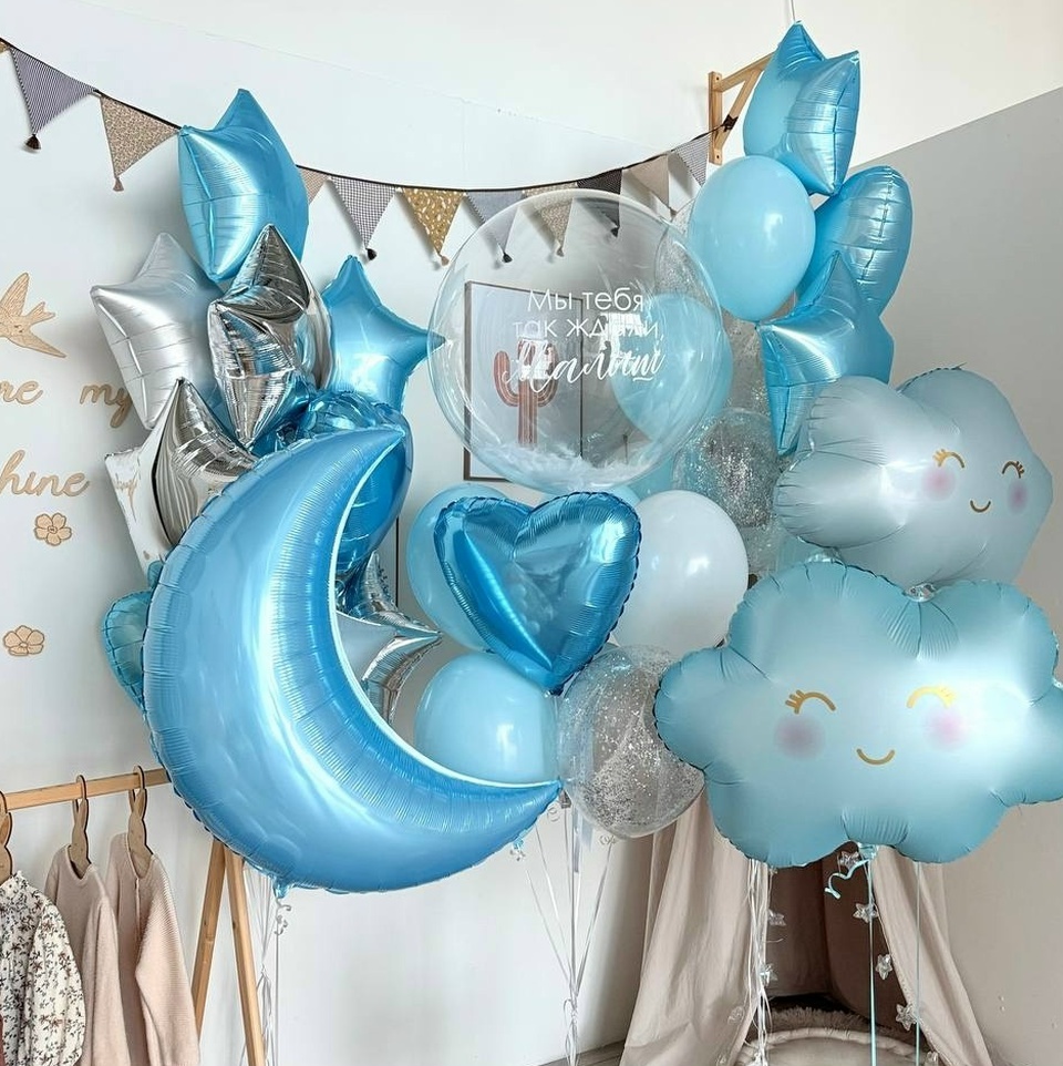 В набор входит: связка ( 6 звезд, 4 сердца), связка( 4 голубых шара, 3 шара с конфетти, 2 звезды, 1 сердце), 2 облака голубых, месяц, связка (2 голубых шара, 2 белых шара, 2 шара с конфетти, 2 сердца, баблс с перьями и надписью