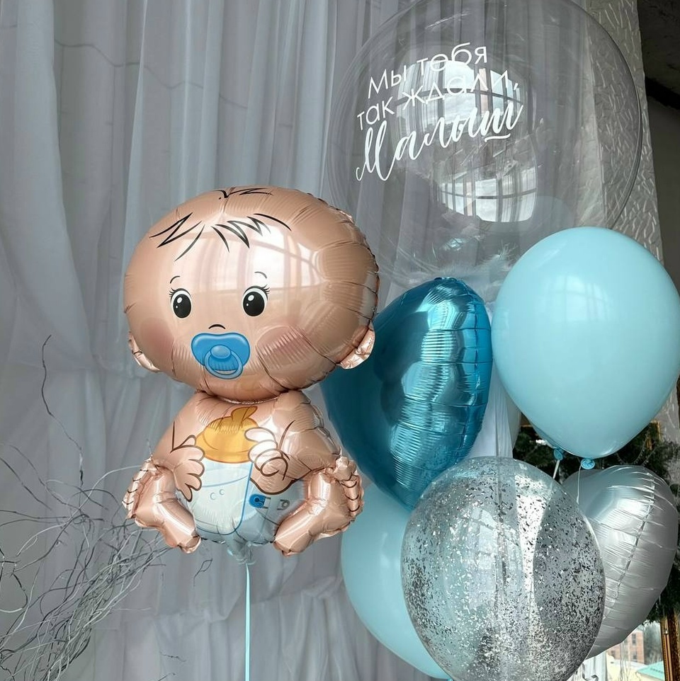 В набор входит: связка ( 2 голубых шара, 2 белых шара, 2 шара с конфетти, 2 сердца, баблс с перьями и надписью), малыш