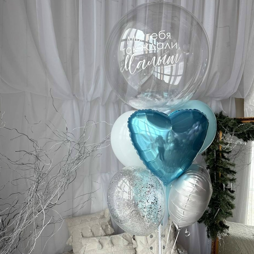 В набор входит: связка ( 2 голубых шара, 1 белый шар, 1 шар с конфетти, 2 сердца, баблс с перьями и надписью