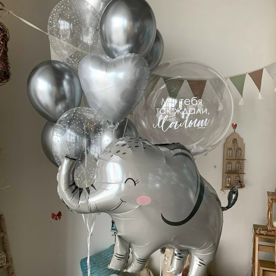 В набор входит: связка(5 серебряных шаров, 3 шара с конфетти, 2 сердца), баблс с перьями и надписью, слоник