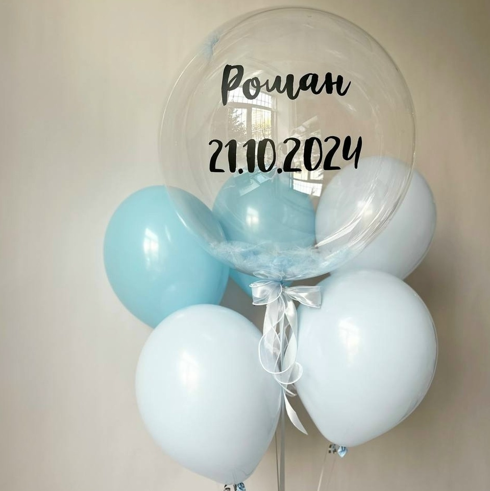В набор входит: Связка( 3 нежно голубых шара, 2 голубых шара, баблс с перьями и надписью)