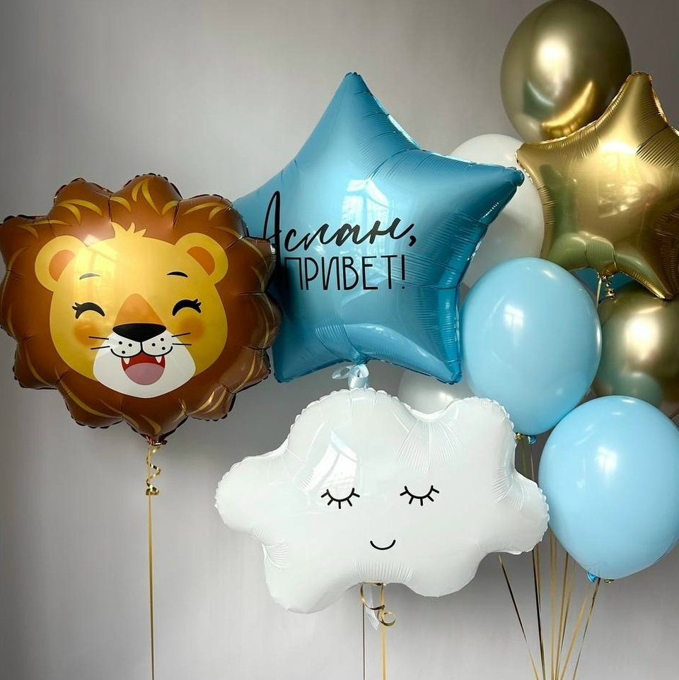 В набор входит: связка ( 3 голубых шара, 2 белых шара, 2 золотых шара,1 звезда), облако, львенок, звезда (75см) с надписью