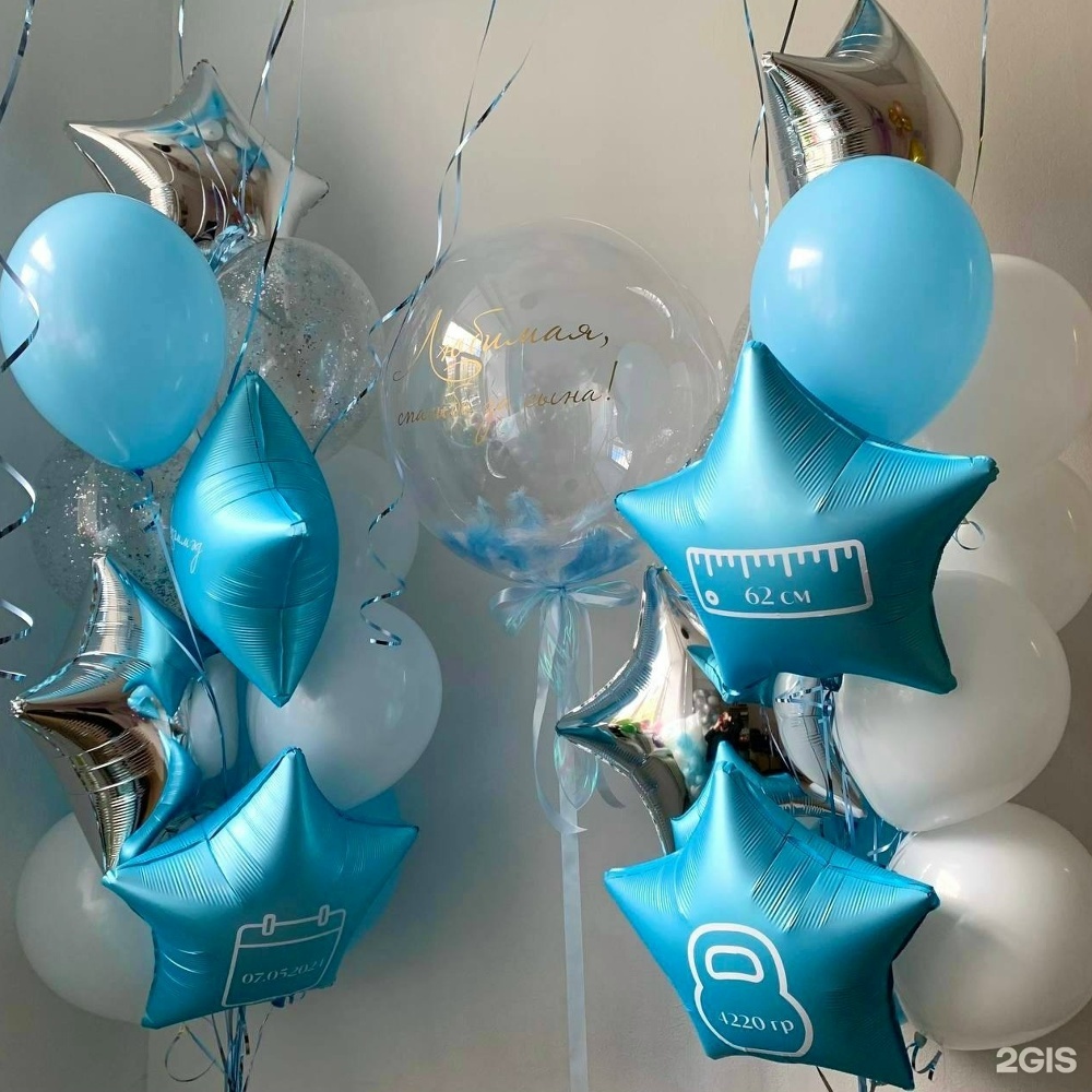 2 связки (4 белых шара, 3 голубых шара, 2 шара с конфетти, 2 серебряные звезды, 2 голубые звезды с надписями), Баблс с перьями и надписью