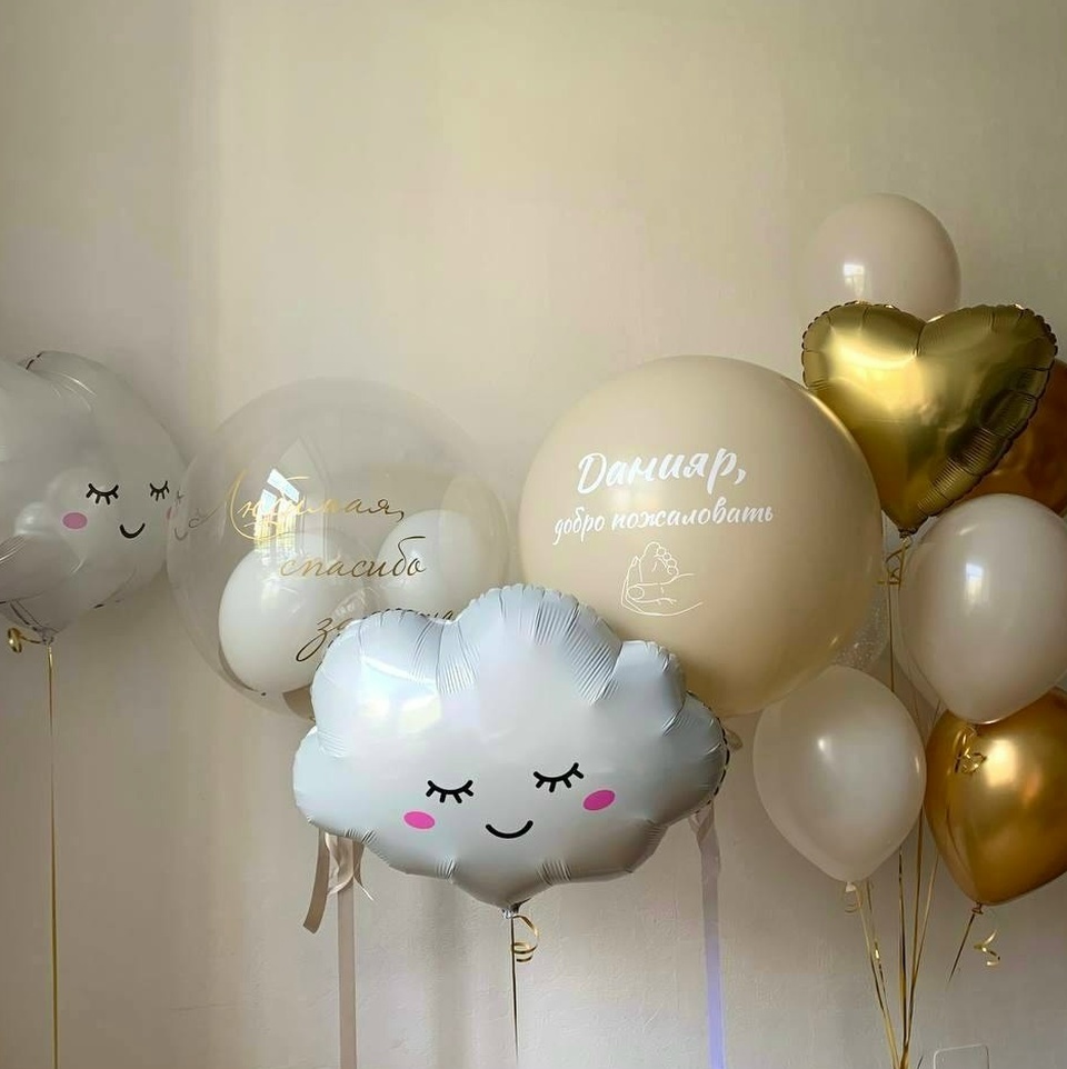 Связка ( 2 золотых шара, 1 сердце, 1 шар с конфетти, 6 бежевых шаров), 2 облака, большой бежевый шар с надписью, баблс с маленькими шарами внутри и надписью