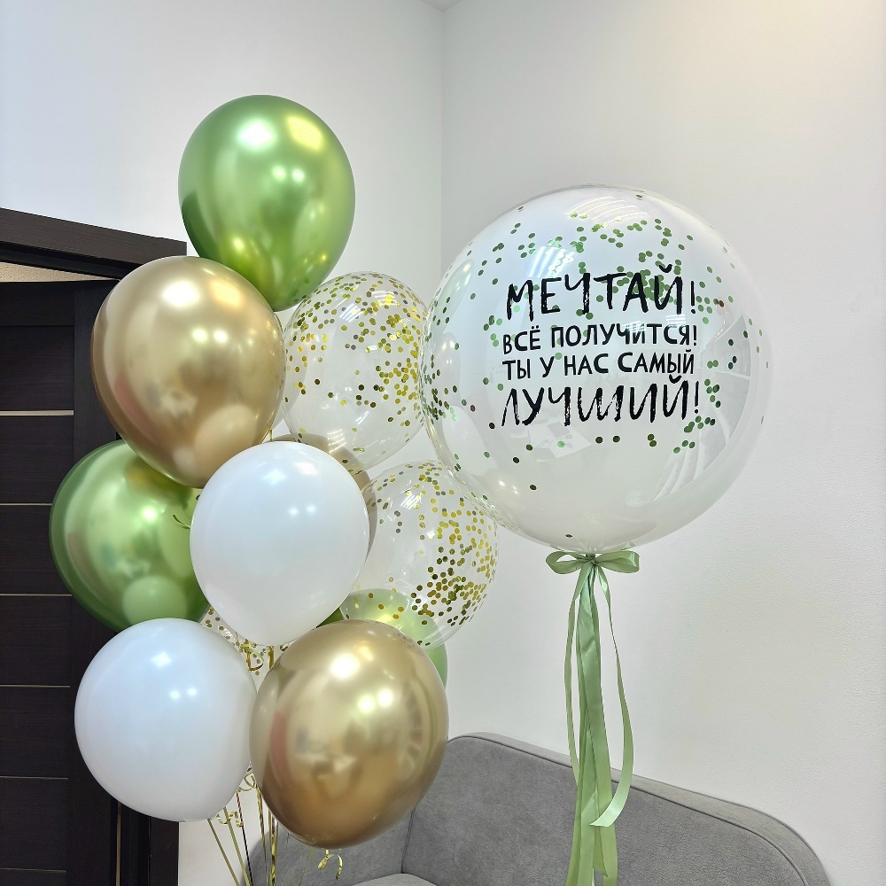Связка: 3 хром зеленых шара, 3 золотых шара, 3 белых шара, 3 шара с конфетти Большой зеркальный шар с конфетти и надписью