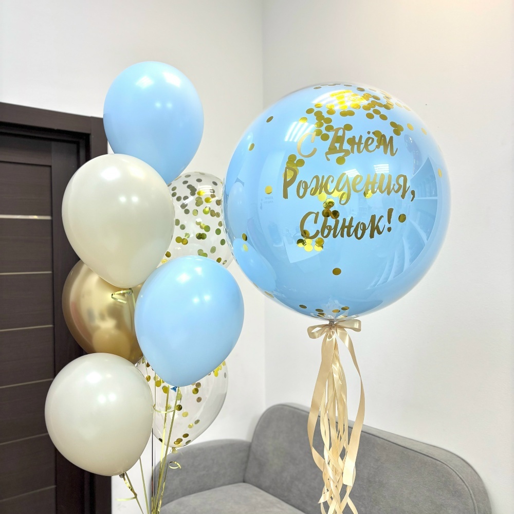 Связка из: 2 голубых Шаров, 2 бежевых Шаров, 2 Шаров с конфетти, 1 золотого шара Большой шар с конфетти и надписью
