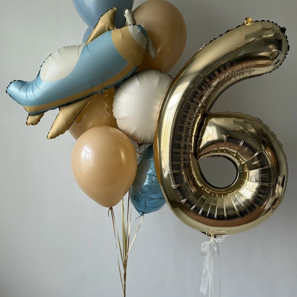 Связка из: 3 пыльно голубых Шаров 3 Шаров карамель 1 круга бежевого 1 круга голубого Самолетика Цифра светлое золото ( на выбор)