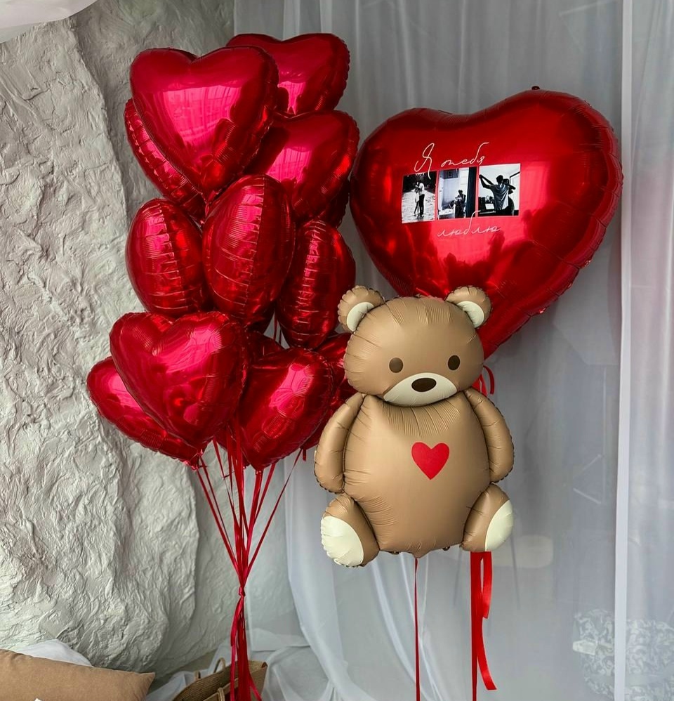 Связка: 15 фольгированных сердец Фигура мишки Сердце большое с вашими фото и надписью