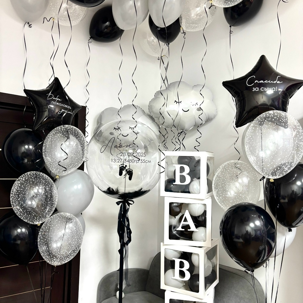 Связка из 10 Шаров, связка из 7 Шаров, 2 фигуры облако, Баблс с перьями и надписью, кубы BABY, 15 шаров в потолок
