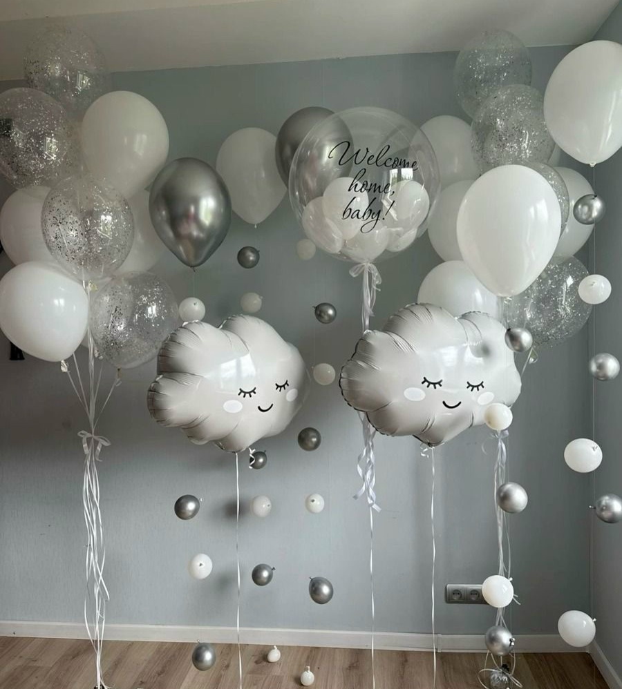 2 связки: 6 белых Шаров, 4 шара с конфетти 5 Шаров цепочек 2 фигуры облако Баблс с шарами внутри и надписью