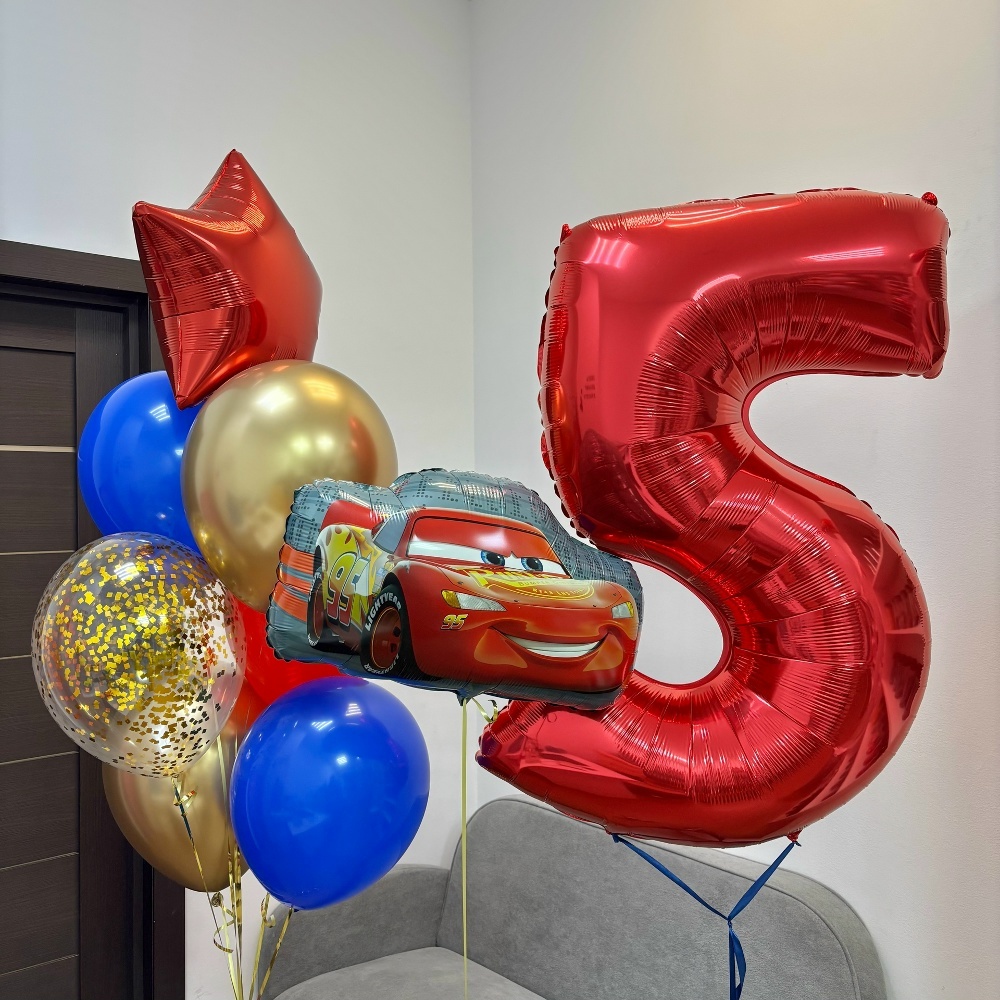 Связка: 2 хром золото шара 1 шар с конфетти золото 2 синих шара 1 красный шар 1 звезда красная Цифра (на выбор) Фигура молния маквин