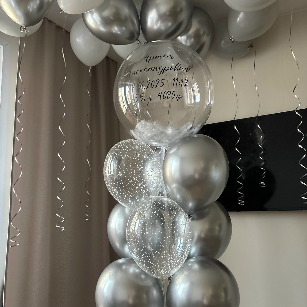 Связка: Баблс шар с перьями и надписью 6 хром серебро Шаров 3 шара с конфетти В потолок: 4 шара хром серебро 4 шара серые 4 шара белые