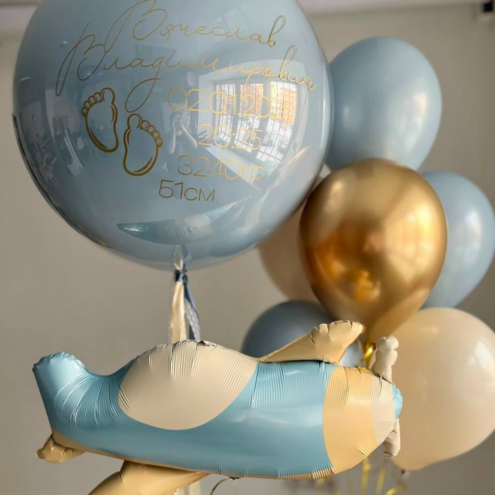 Связка: 3 шара ретро голубой 2 бежевых шара 2 золотых шара Самолет фигура Большой зеркальный шар с надписью (Дополнение: Шары в потолок 10 шт +1600р)