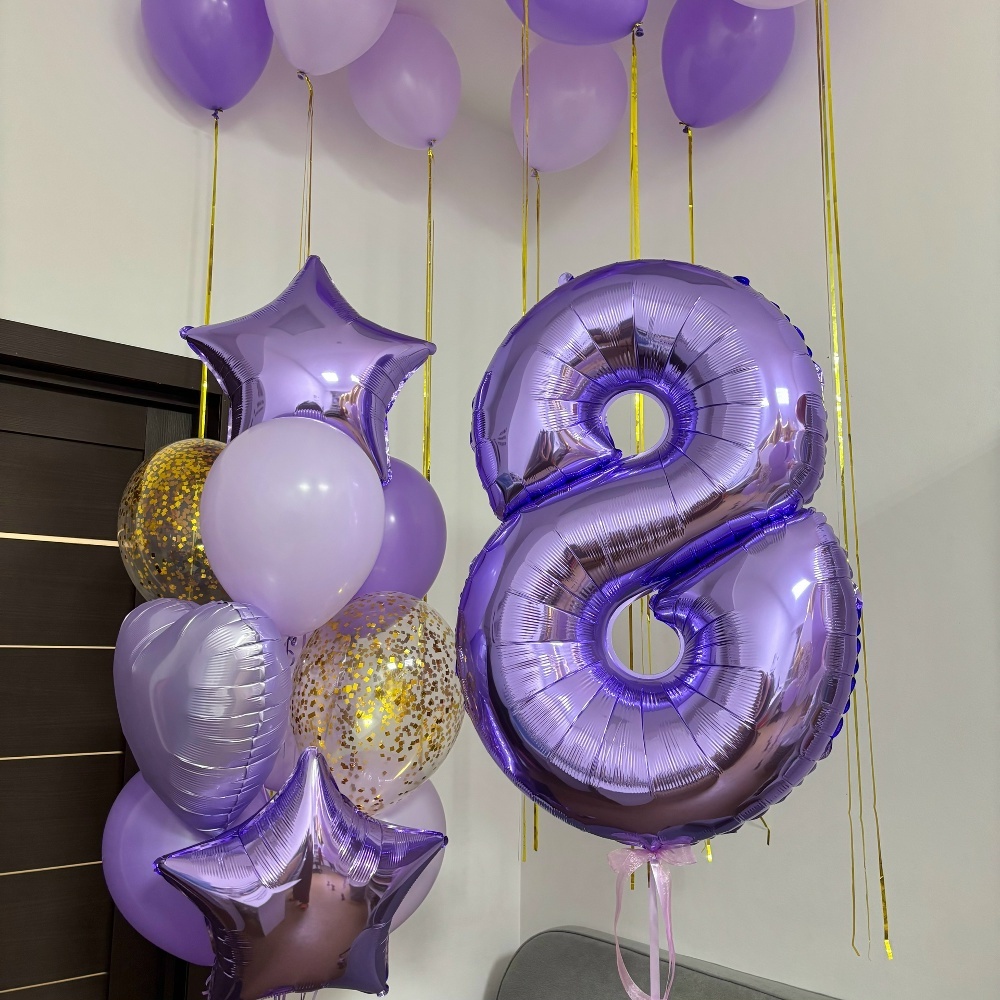Связка: 3 светло сиреневых шара 2 сиреневых шара 2 шара с конфетти 2 звезды 1 сердце Цифра ( на выбор) В потолок: Шары с дождиком 8 шт
