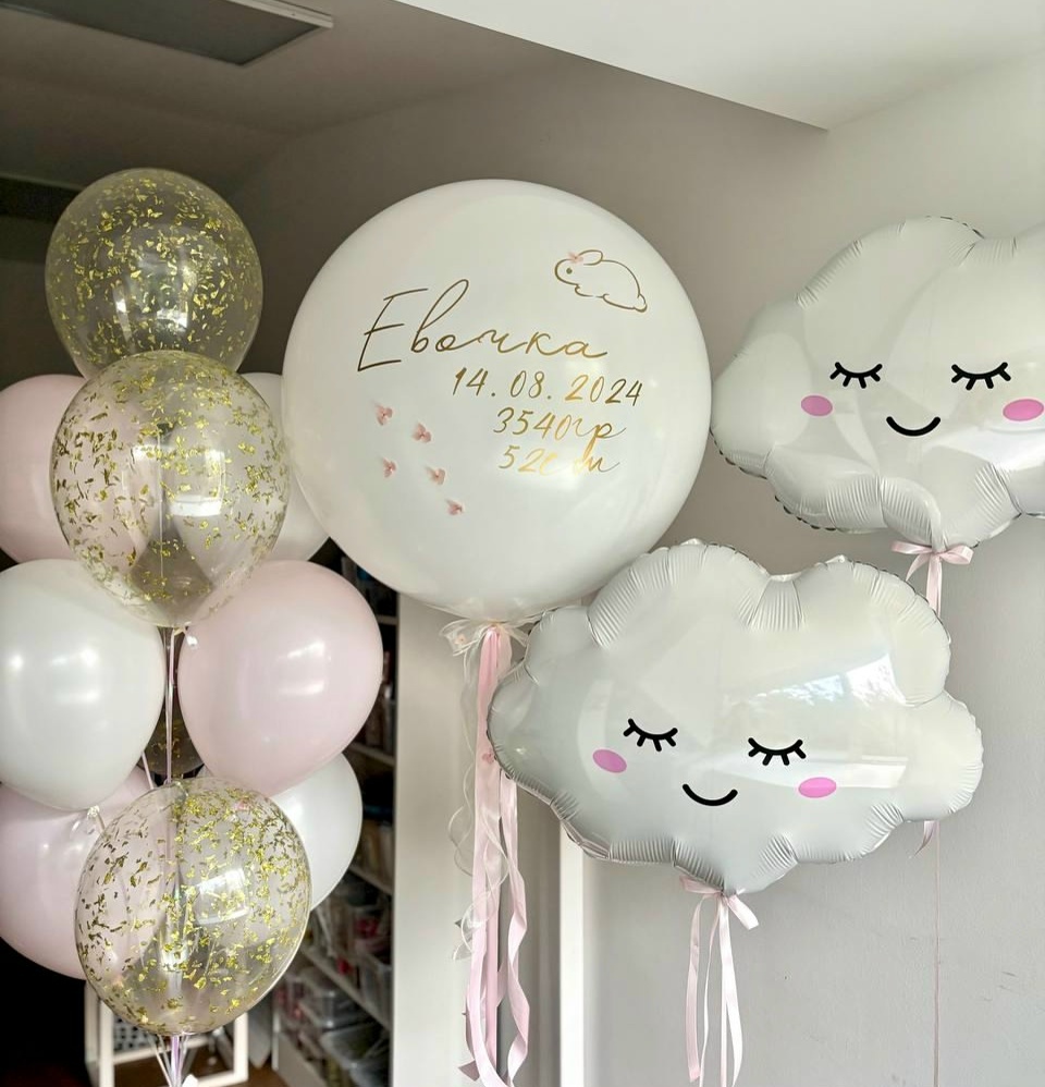 Связка: 3 розовых шара 3 белых шара 4 шара с конфетти Большой шар с надписью 2 фигуры облака