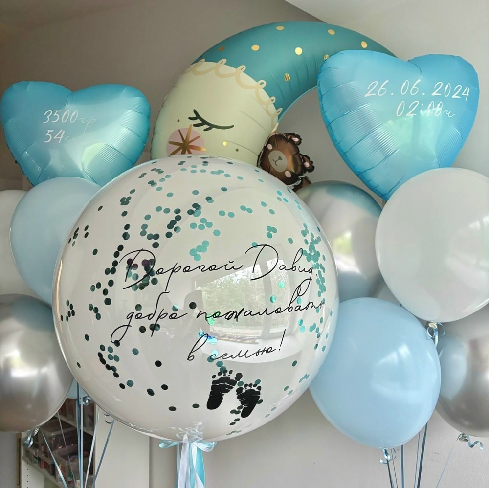 2 связки: 2 белых шара 2 голубых шара 2 серебряных шара 1 сердце голубое с надписью Фигура мишка на луне Большой зеркальный шар с конфетти и надписью